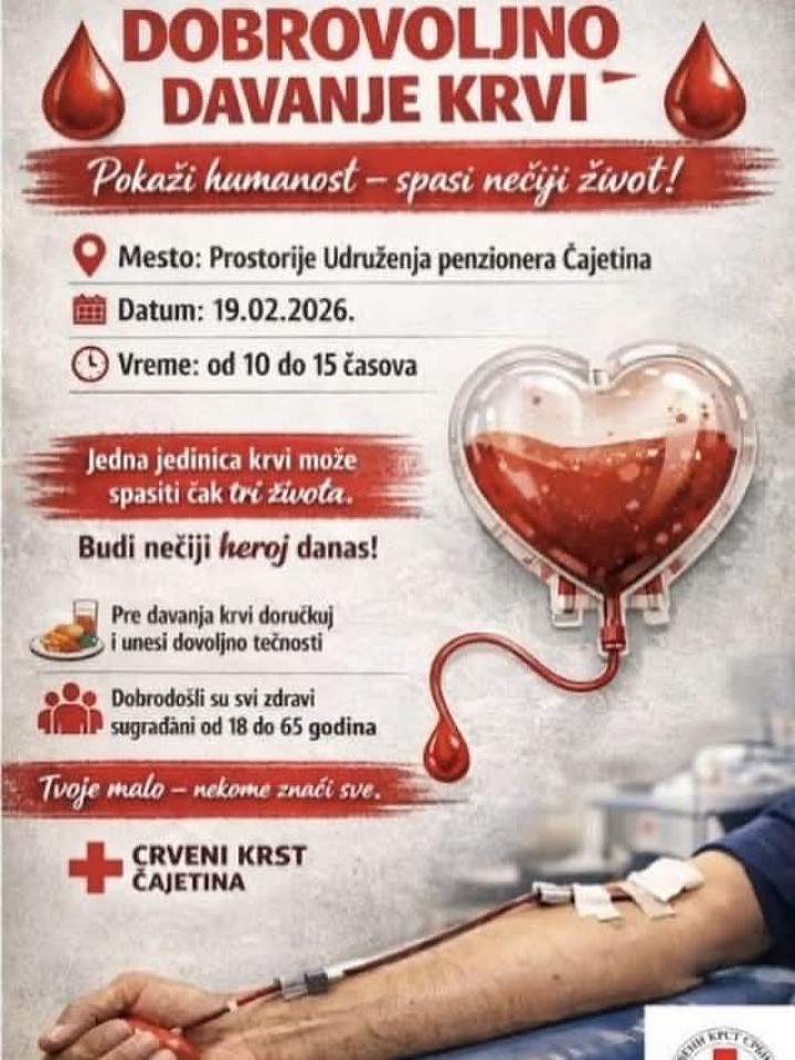 Redovna akcija dobrovoljnog davanja krvi u organizaciji Crvenog krsta Čajetina i Službe za transfuziju krvi OB Užice, sprovešće se u četvrtak, 19. februara u prostorijama Udruženja penzionera Čajetina u terminu od 10 časova i trajati do 15 časova.