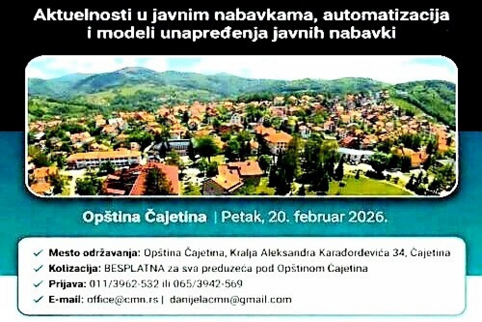 U Opštini Čajetina u petak, 20. februara 2026. godine, biće održan jednodnevni seminar „Aktuelnosti u javnim nabavkama, automatizacija i modeli unapređenja javnih nabavki“. Seminar organizuju Centar za menadžment d.o.o. i Jedro Systems, a namenjen je predstavnicima javnog sektora i preduzećima sa teritorije opštine Čajetina. Kotizacija je besplatna za sva preduzeća pod Opštinom Čajetina. O aktuelnostima u sistemu javnih nabavki, praktičnim izazovima i automatizaciji procesa govoriće prof. dr Marko Špiler, Nikola Živančević i Nemanja Joksimović. Program počinje u 11 časova registracijom učesnika, a završava se sesijom pitanja i odgovora. Dodatna pogodnost za sve učesnike jeste da će oni koji prisustvuju seminaru u Čajetini ostvariti pravo na BESPLATNU KOTIZACIJU za seminar koji će biti održan na Zlatiboru, u hotelu „Zlatibor“, od 22. do 25. februara 2026. godine. Pogodnost se odnosi isključivo na kotizaciju, dok troškovi smeštaja nisu obuhvaćeni ovom ponudom.