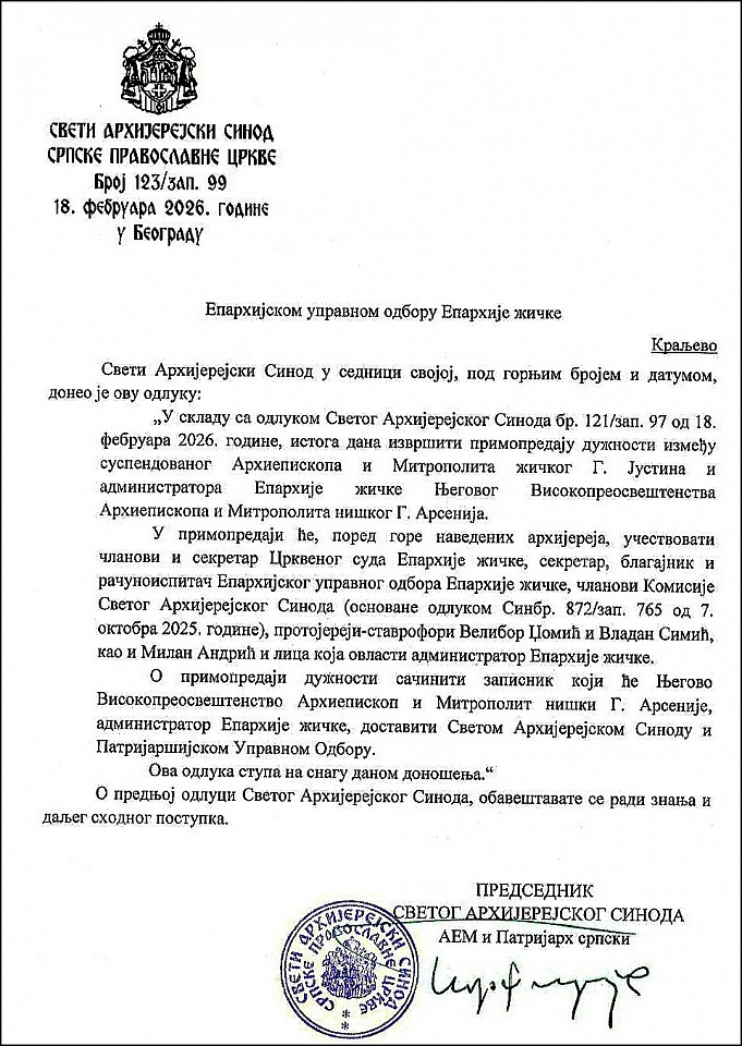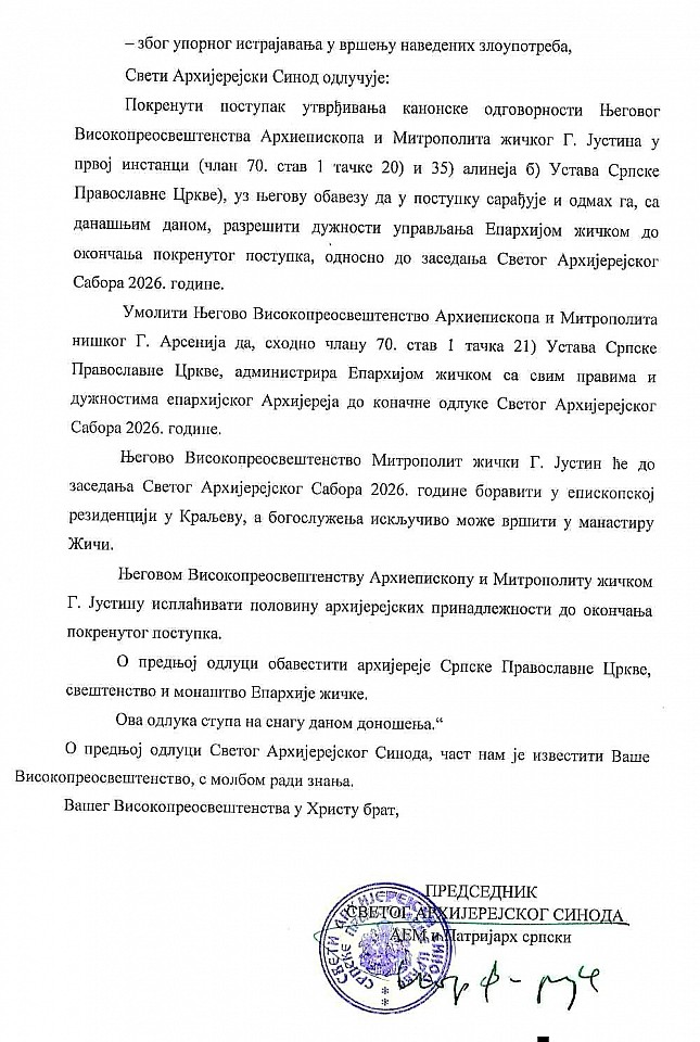Sveti Arhijerejski Sinod Srpske Pravoslavne Crkve je na svojoj sednici 18. februara tekuće godine, na osnovu 74 kanona svetih Apostola i člana 70 stav 1 tački 20 i 35 alineja b) Ustava Srpske Pravoslavne Crkve, doneo odluku kojom je Njegovo Visokopreosveštenstvo Arhiepiskopa i Mitropolita žičkog G. Justina razrešio dužnosti upravljanja poverenom mu Eparhijom žičkom do redovnog zasedanja Svetog Arhijerejskog Sabora 2026. godine, i pokrenuo postupak za utvrđivanje njegove kanonske odgovornosti. Istovremeno, Sveti Arhijerejski Sinod je za administratora Eparhije žičke, do predstojećeg zasedanja Svetog Arhijerejskog Sabora, imenovao Njagovo Visokopreosveštenstvo Arhiepiskopa i Mitropolita niškog G. Arsenija.