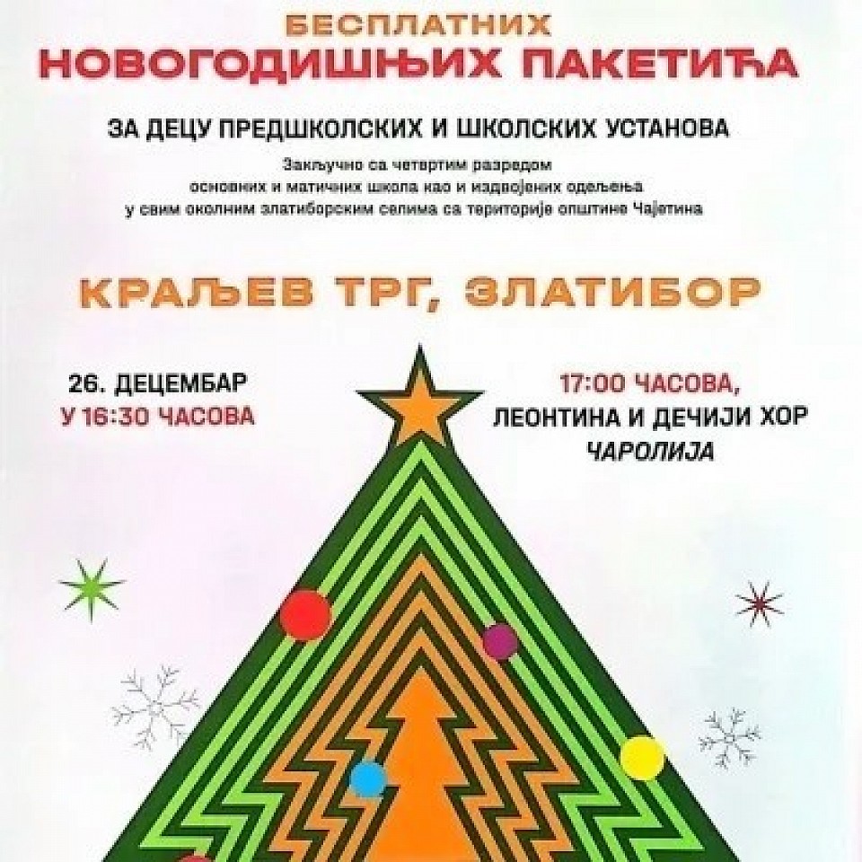 Opština Čajetina i Turistička organizacija Zlatibor i ove godine organizuju tradicionalnu novogodišnju podelu besplatnih paketića za najmlađe, koja će biti održana u petak, 26. decembra, na Kraljevom trgu na Zlatiboru, sa početkom u 16.30 časova