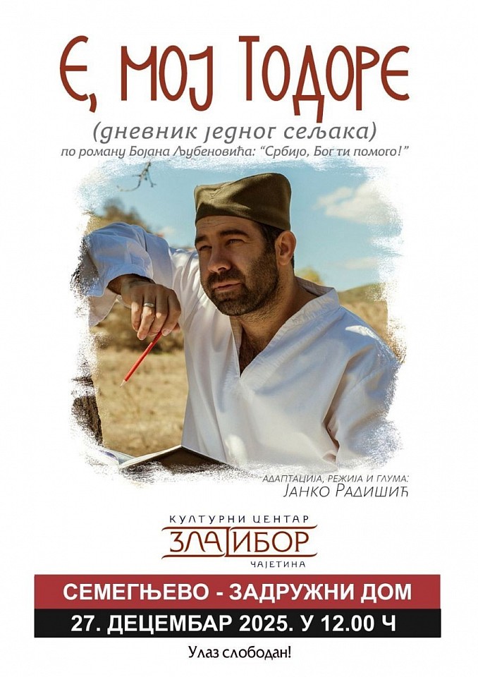 Кulturni program u Zadružnom domu u Semegnjevu obnoviće se izvođenjem monodrame Janka Radišića "E, moj Todore" u subotu 27. decembra, u 12 časova. Ulaz je slobodan!