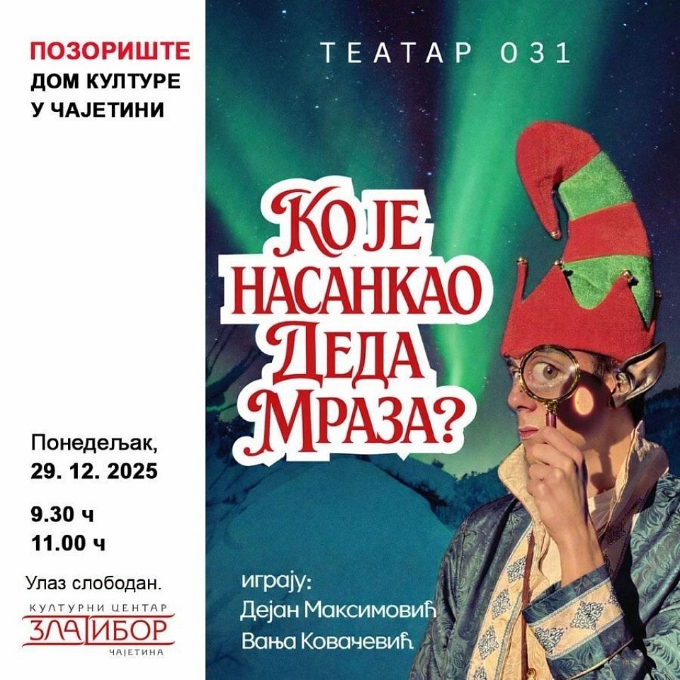 U okviru programa "Novogodišnji kulturni dar deci", biće izvedena dečja predstava "Кo je nasankao Deda Mrza?", u ponedeljak, 29. decembra, u Domu kulture u Čajetini, u dva termina: u 9 i 11 časova