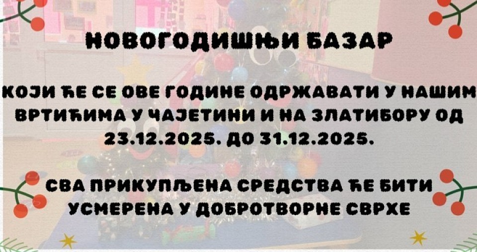 U vrtićima u Čajetini i na Zlatiboru i ove godine biće organizovan Novogodišnji bazar, koji će, kao i prethodnih godina, imati humanitarni karakter. Manifestacija ima za cilj da, kroz prazničnu atmosferu i dečju kreativnost, pruži podršku ugroženim porodicama u lokalnoj zajednici.