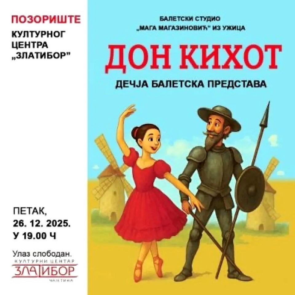 Kulturni centar Zlatibor nastavlja novogodišnji kulturni program namenjen najmlađima i njihovim porodicama izvođenjem dečje baletske predstave „Don Kihot“. Predstava će biti održana u petak, 26. decembra, sa početkom u 19 časova, u sali Kulturnog centra na Zlatiboru.