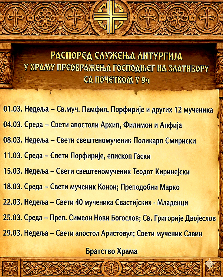 Распоред служења светих Литургија за март