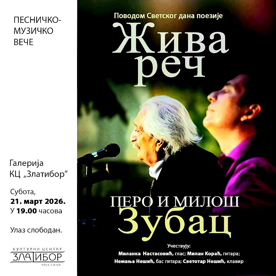 Поводом светског дана поезије, Културни центар, у суботу, 21. марта, у 19 часова, организује организује Песничко-музичко вече „Жива реч” – Перо и Милош Зубац.