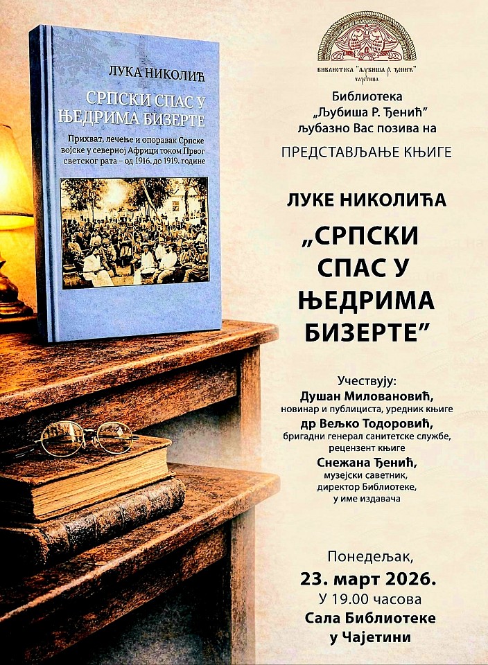 Biblioteka „Ljubiša R. Đenić“ Čajetina organizuje predstavljanje knjige „Srpski spas u njedrima Bizerta“ autora Luke Nikolića.