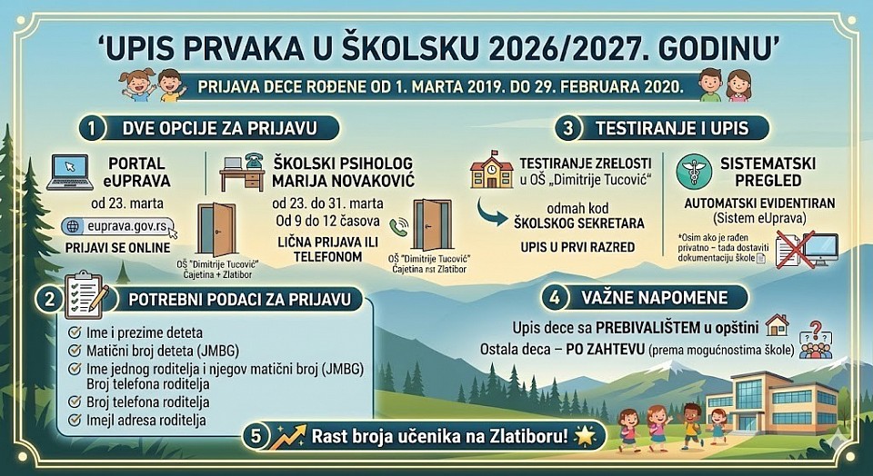 Kako je istakla pedagog Jelena Žugić u OŠ "Dimitrije Tucović" u Čajetini i na Zlatiboru, roditelji mogu prijaviti dete za testiranje zrelosti preko portala eUprava od 23. marta 💻 ili kod školskog psihologa Marije Novaković od 23. do 31. marta, od 9 do 12 časova. Prilikom prijave potrebno je dostaviti sledeće podatke: ime i prezime deteta, matični broj deteta, ime jednog roditelja i njegov matični broj, broj telefona roditelja i imejl adresu.