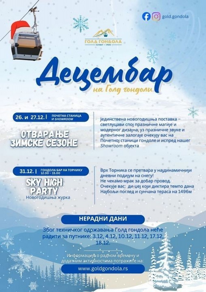 Otvaranje zimske sezone 26. i 27. decembra na početnoj stanici i showroom jedinstvena novogodišnja postavka, svetlucavi spoj praznične magije i modernog dizajna, uz praznične zvuke i autentične zalogaje očekuju vas na početnoj stanici gondole i ispred showroom objekta